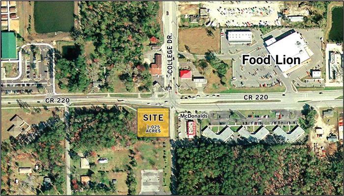 Prime 1.025 acre retail hard corner at signalized intersection, zoned BA, utilities at site, CR 220 being 4 laned in front of site. Owner will consider Land Lease